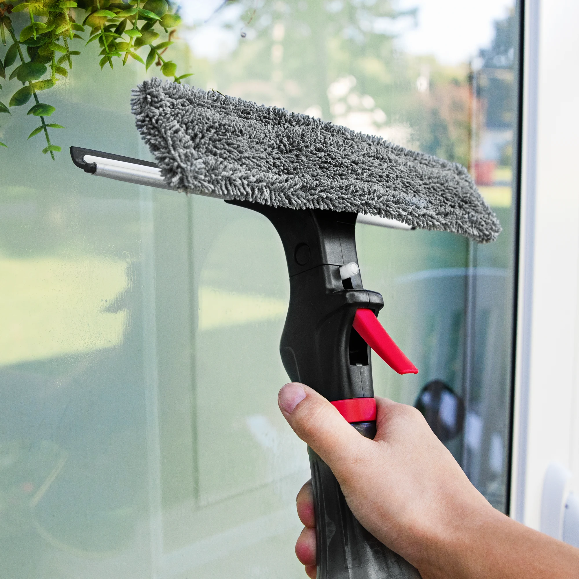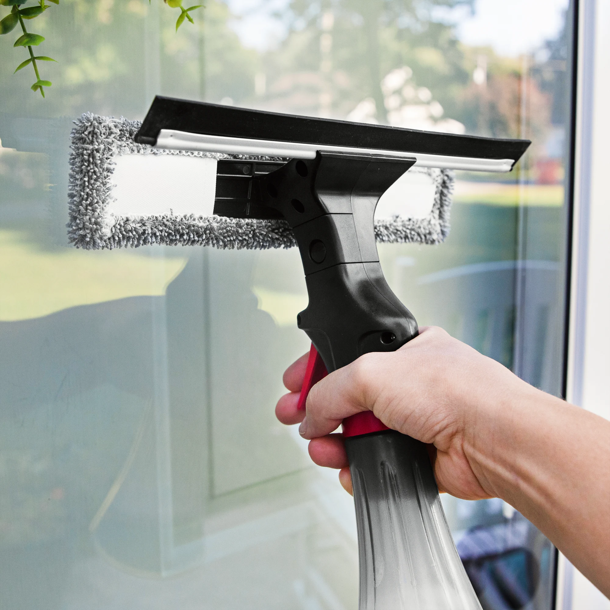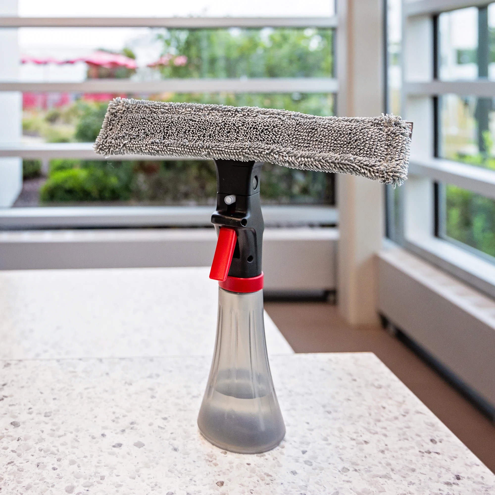 - Features a rubber blade, microfiber cloth, and spray bottle