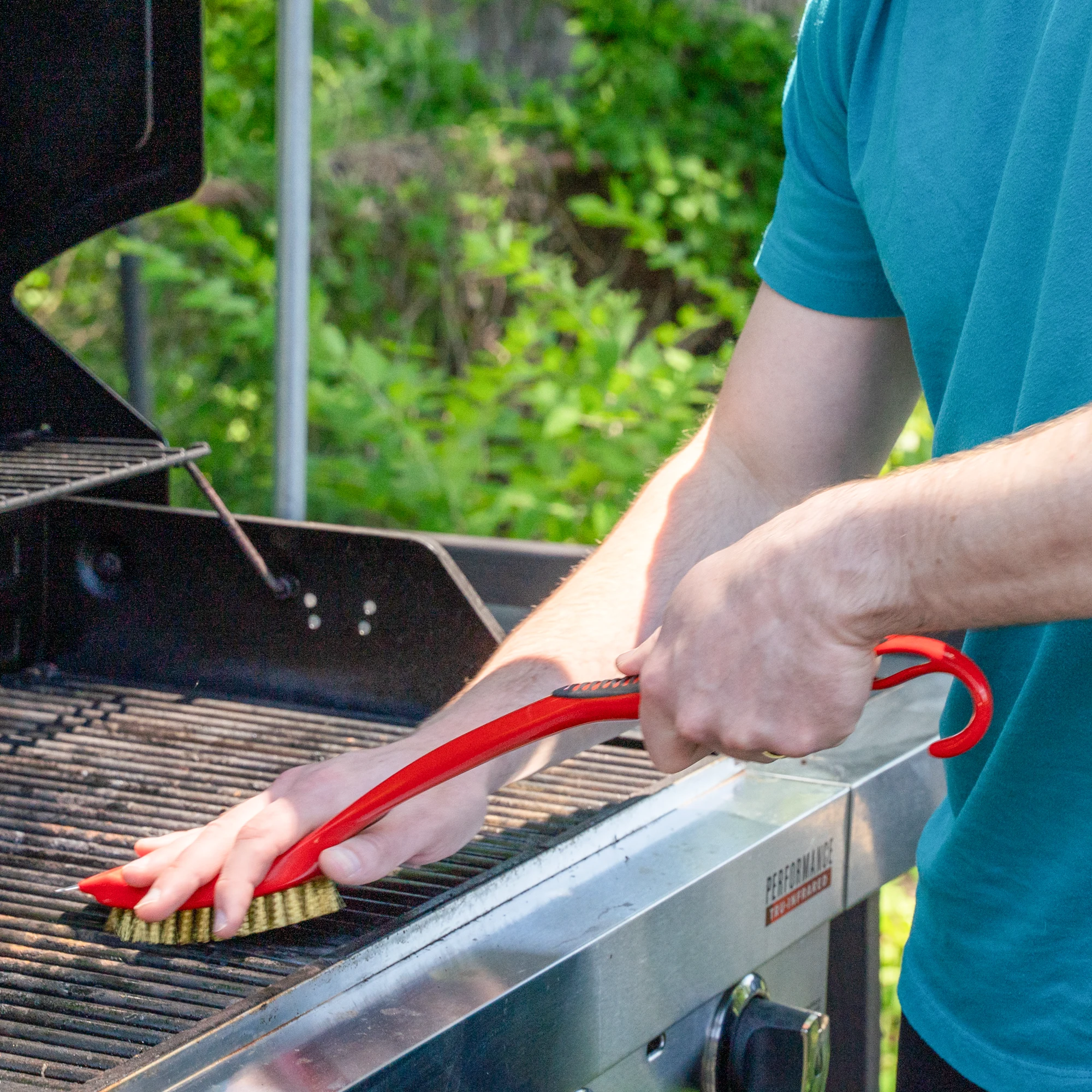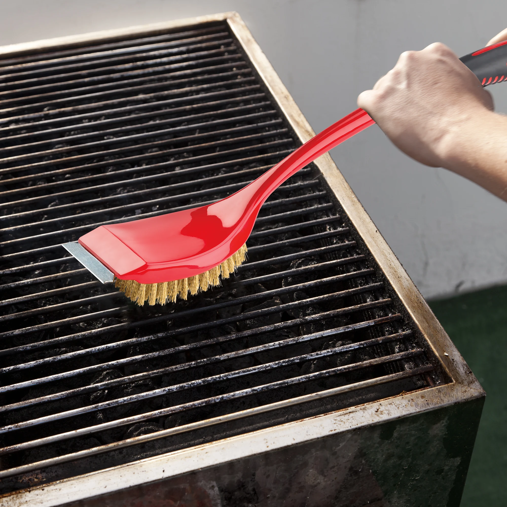 The Extra-Long Handle BBQ Brush with Scraper is a long-handle grill brush with the added strength and comfort of the dual-molded handle. Its hanger hook makes storage convenient.