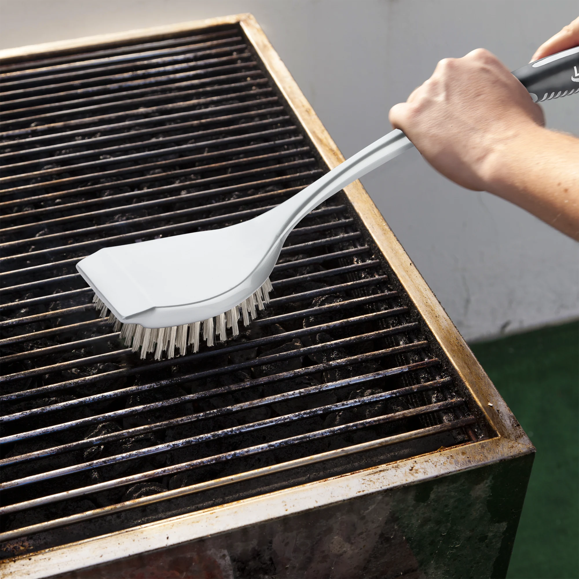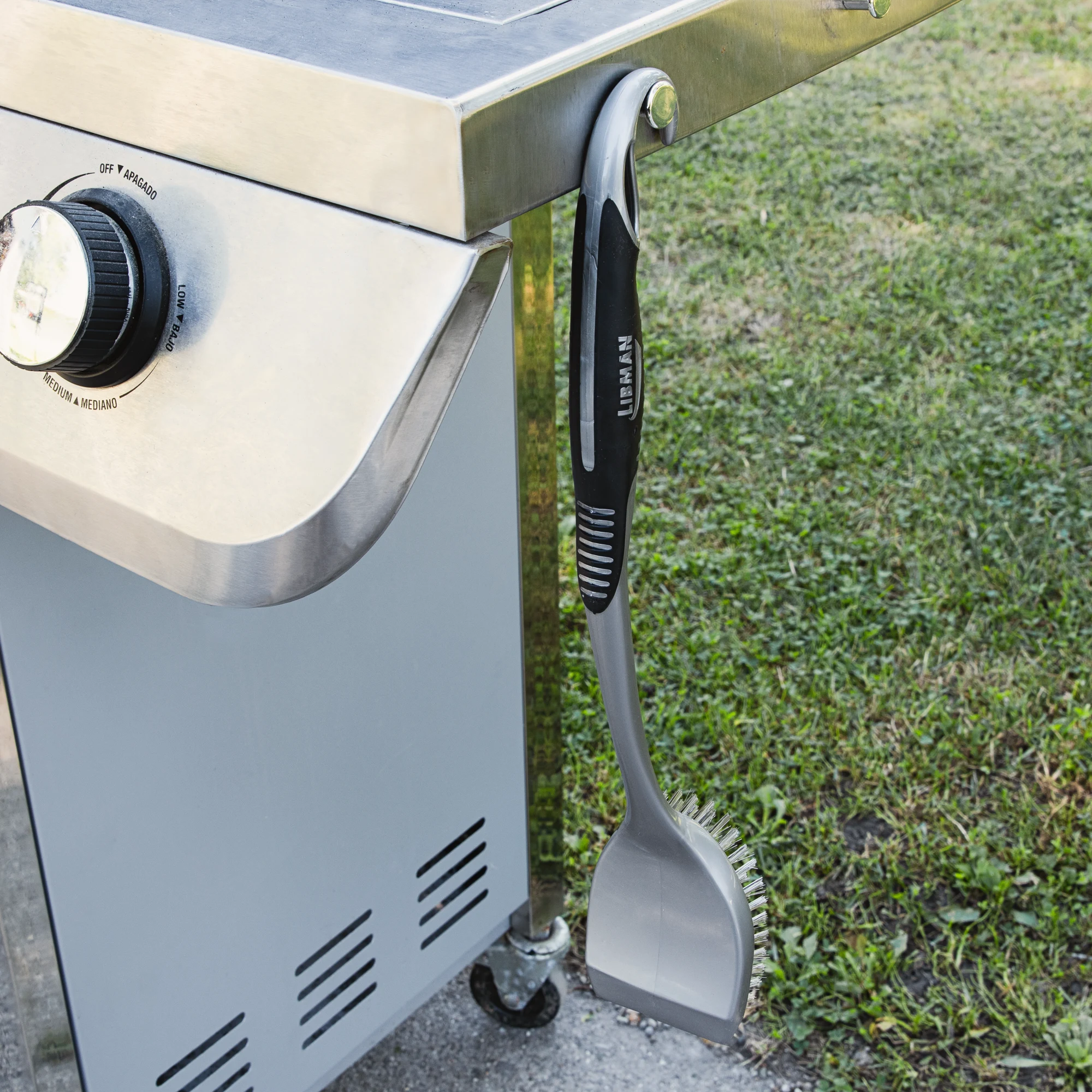 The Extra-Long Handle Steel Brush is a long-handled grill brush with the added strength and comfort of the dual-molded handle. Its hanger hook makes storage convenient.