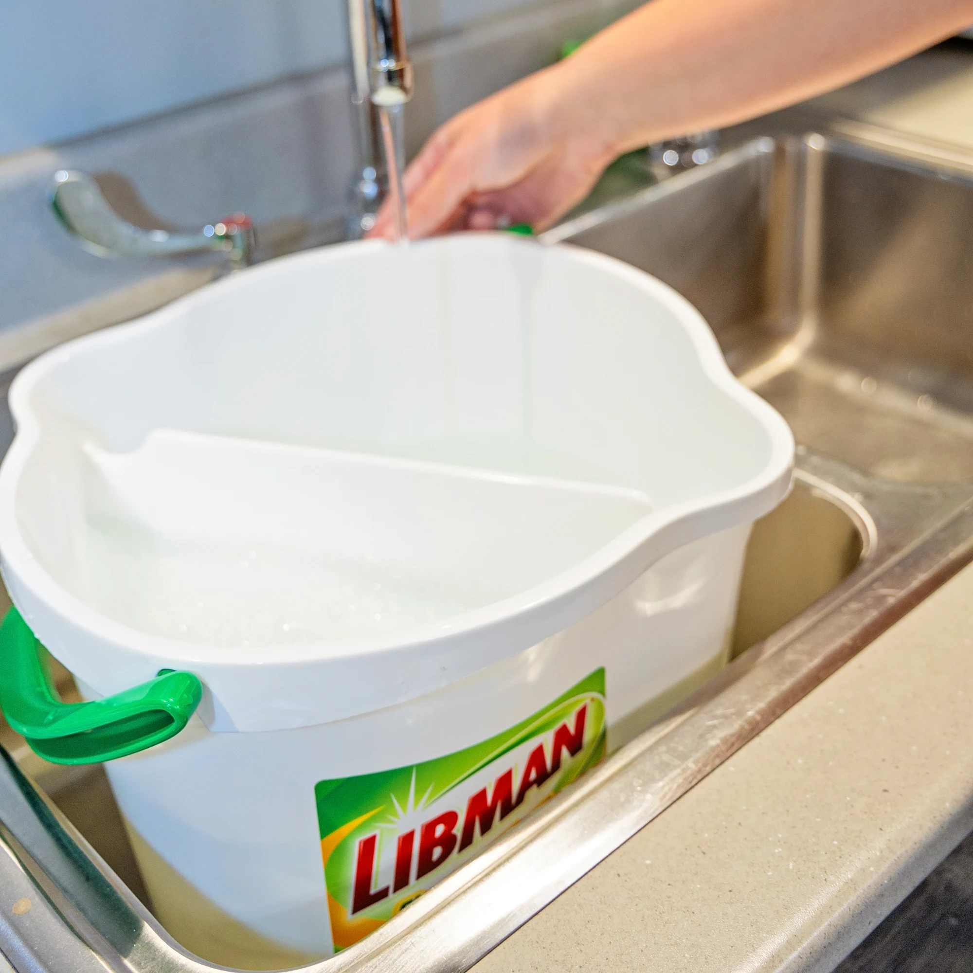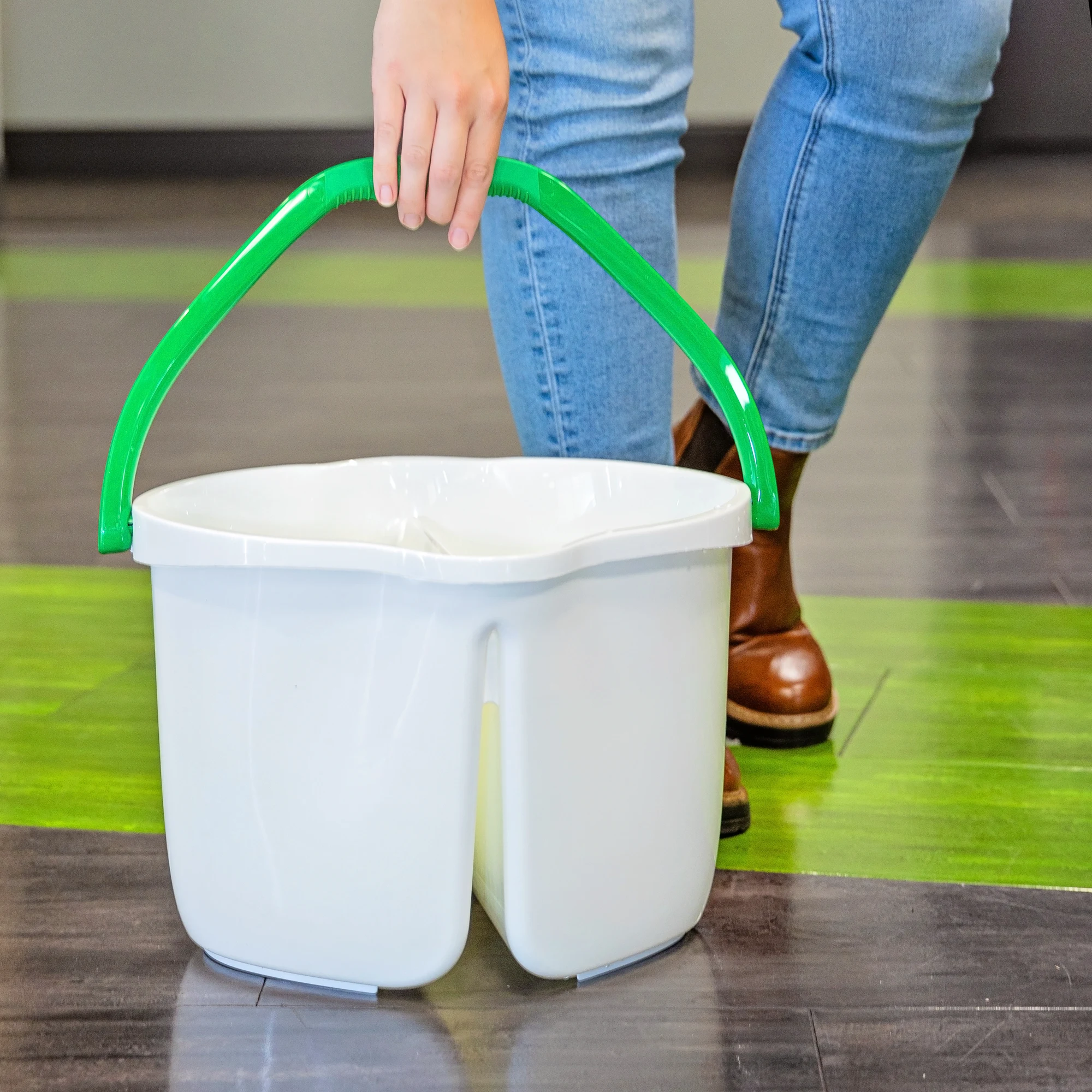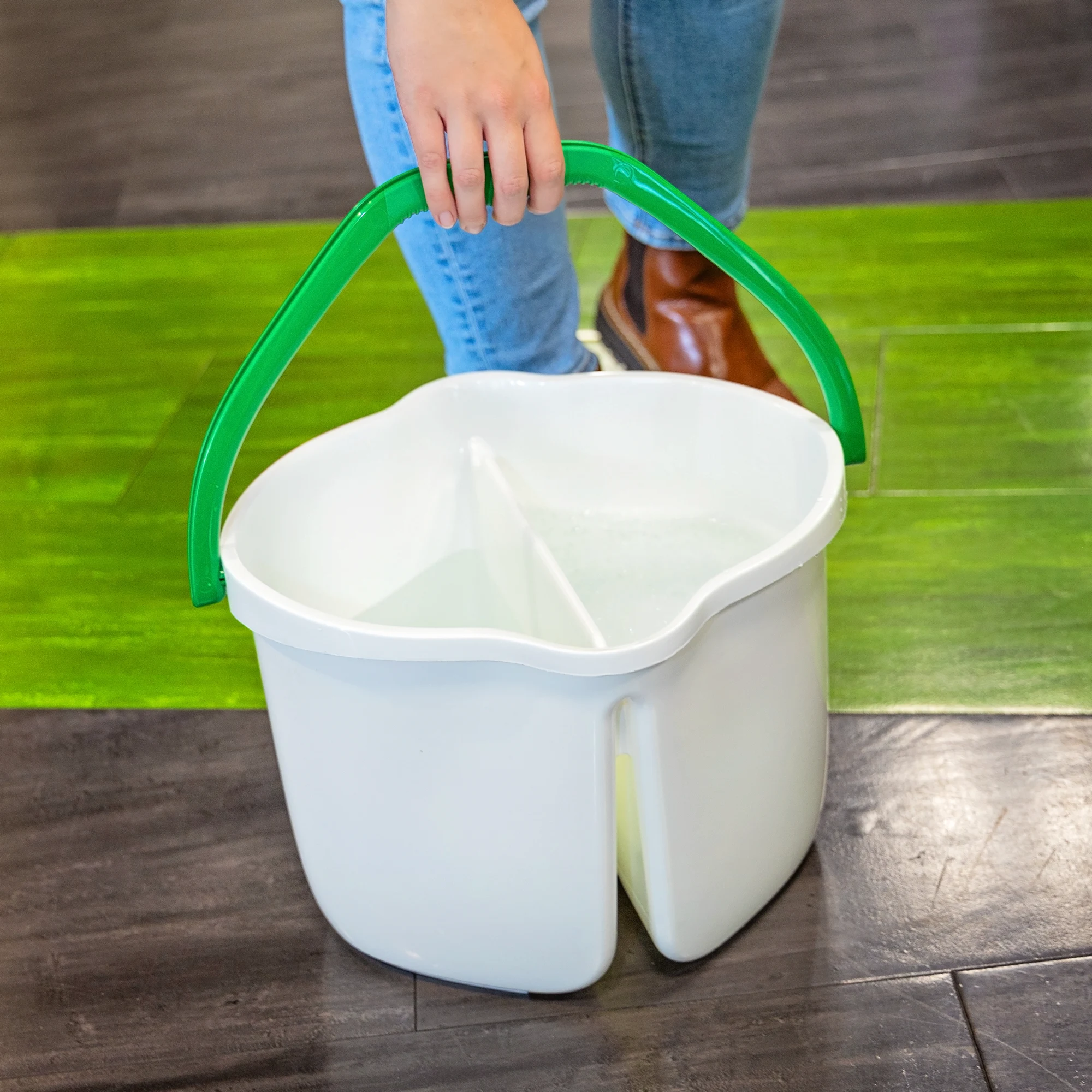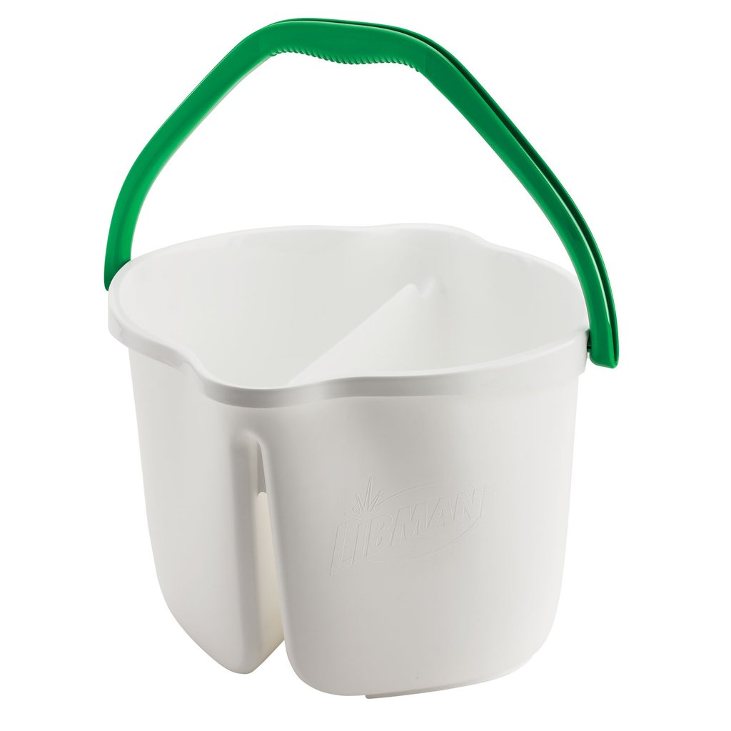 The Clean & Rinse Bucket features a 3-gallon design for the Wonder Mop® and the Tornado Mop®. A divider keeps dirty and clean water separate, keeping floors clean.