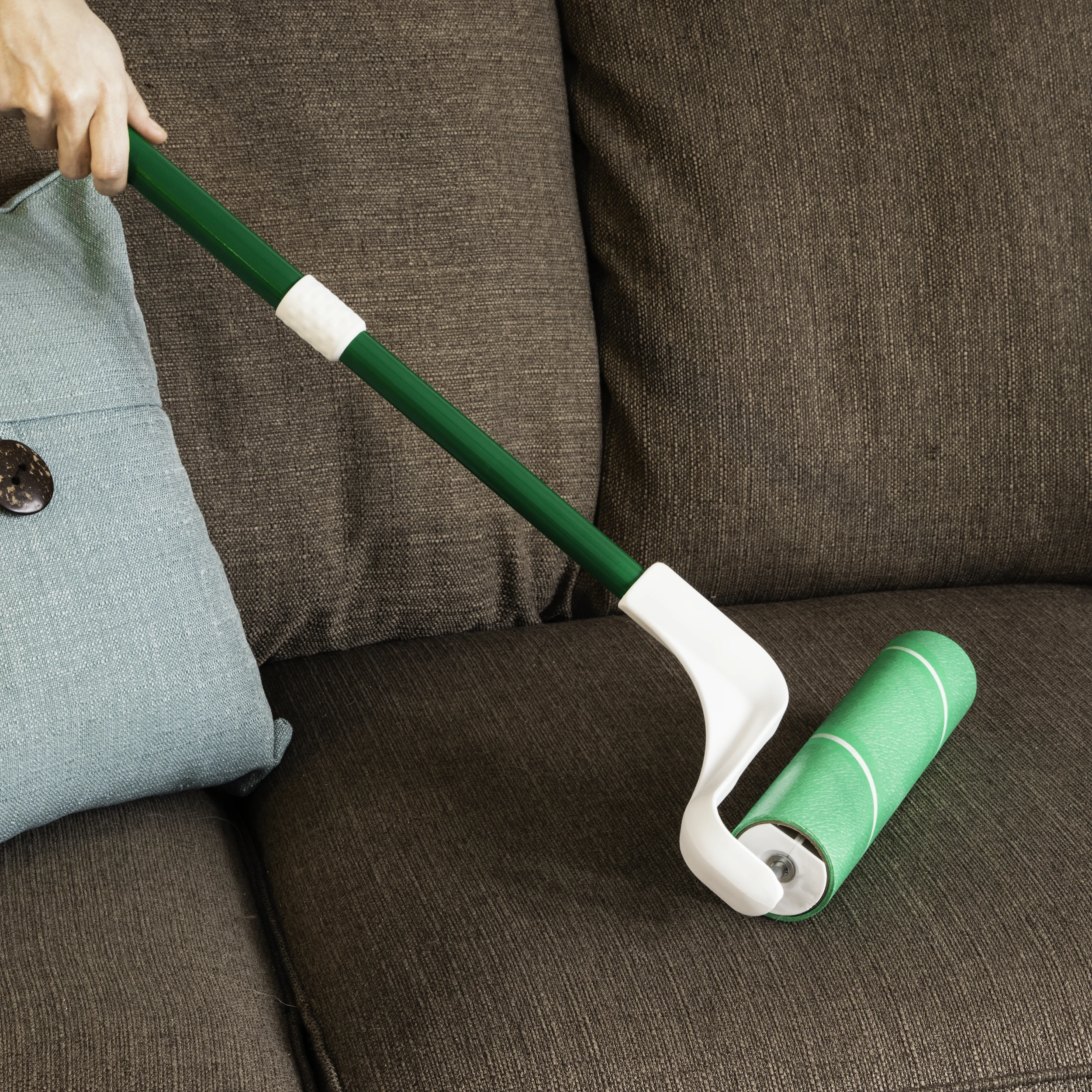 The Extra-Wide Lint Roller features a steel handle that extends to 3 feet in length. This unique design allows for a standing or sitting roll of the sticky sheets over large surfaces.