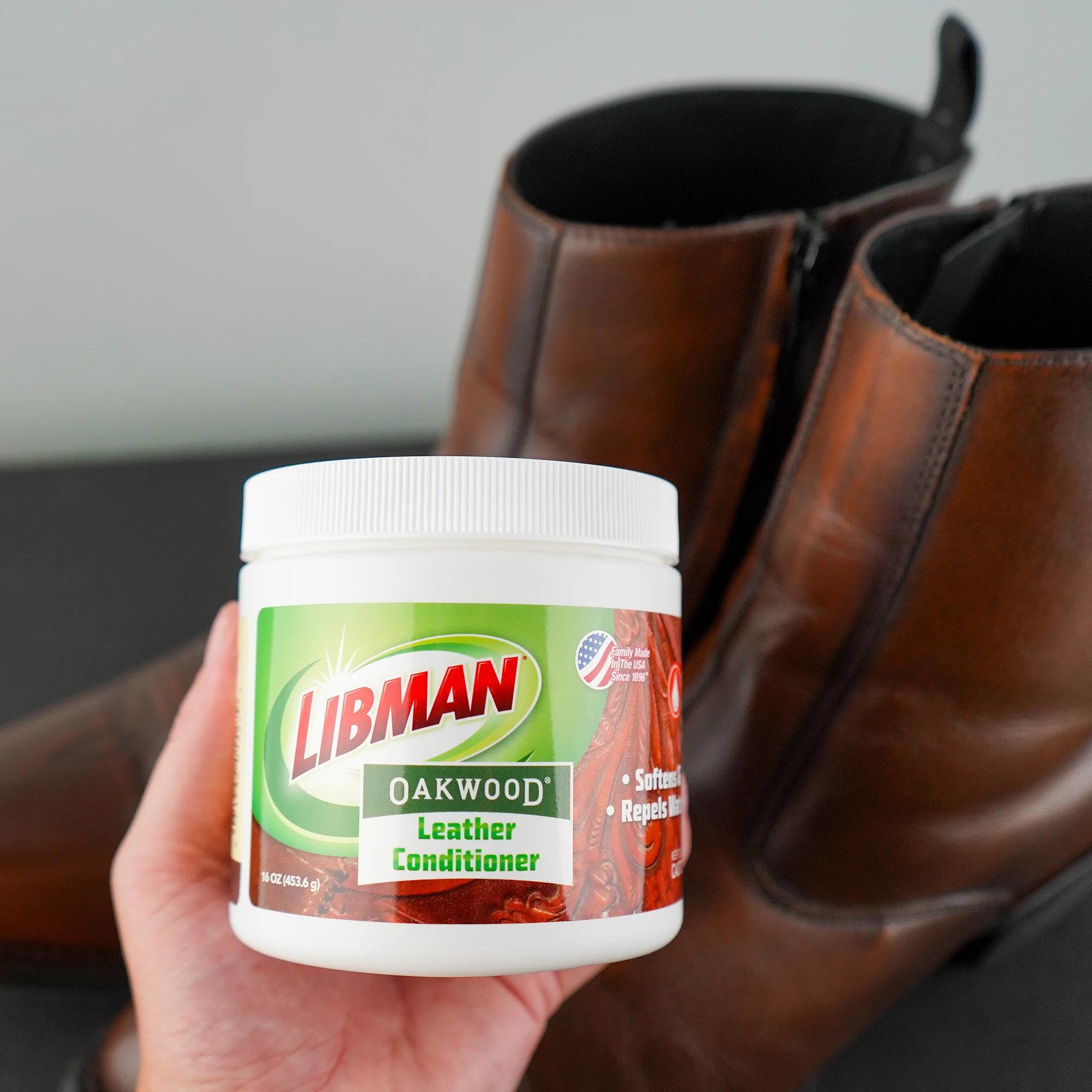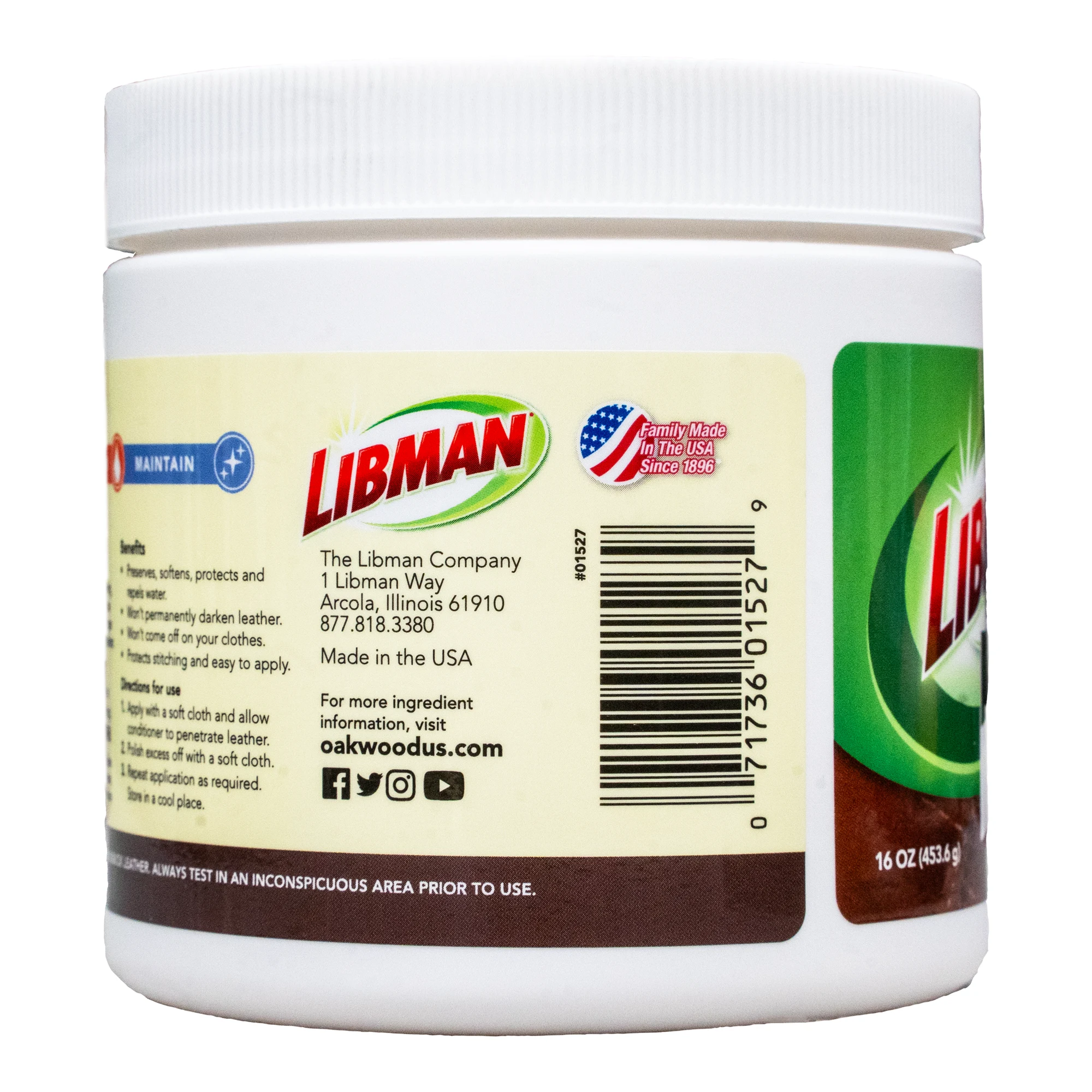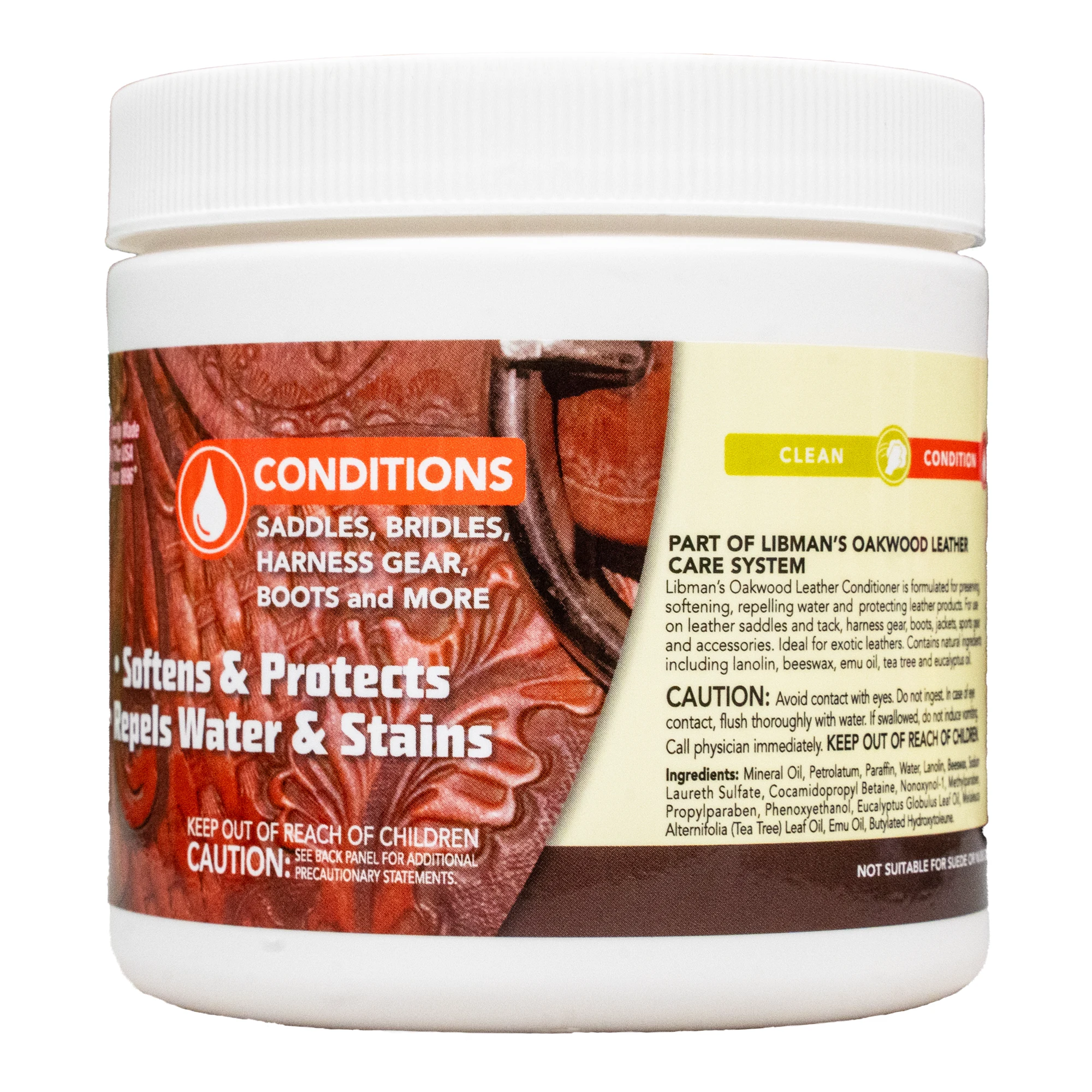 Protect your saddlery and other leather riding gear with Libman's Oakwood Leather Conditioner. This unique leather dressing cream uses a balanced mix of waxes and oils, including lanolin, beeswax, emu oil, tea tree, and eucalyptus oils, to soften and intensely rehydrate leather items while actively repelling moisture and stains.