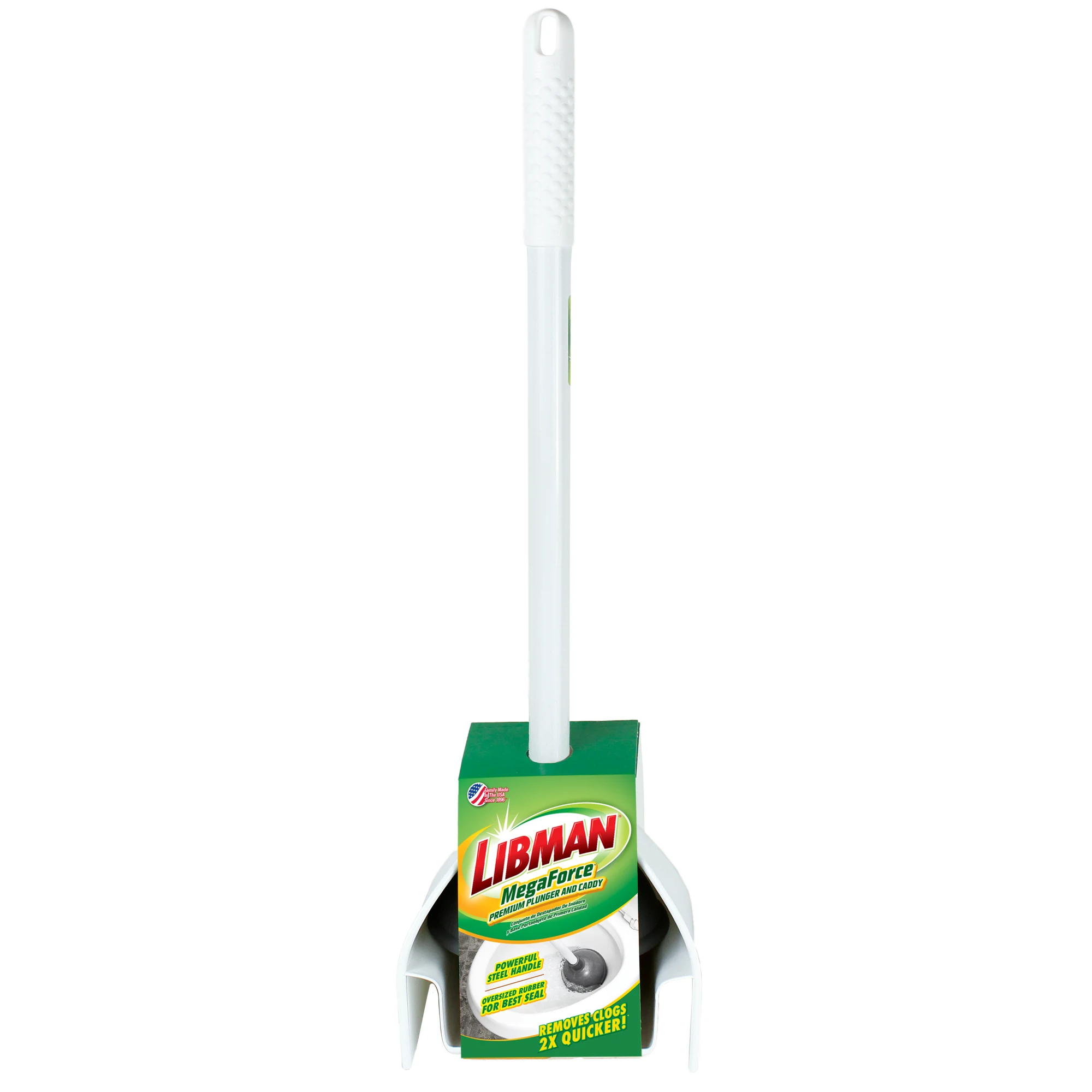 Premium plunger removes clogs 2 times quicker. Includes caddy with slitted vents for faster drying.