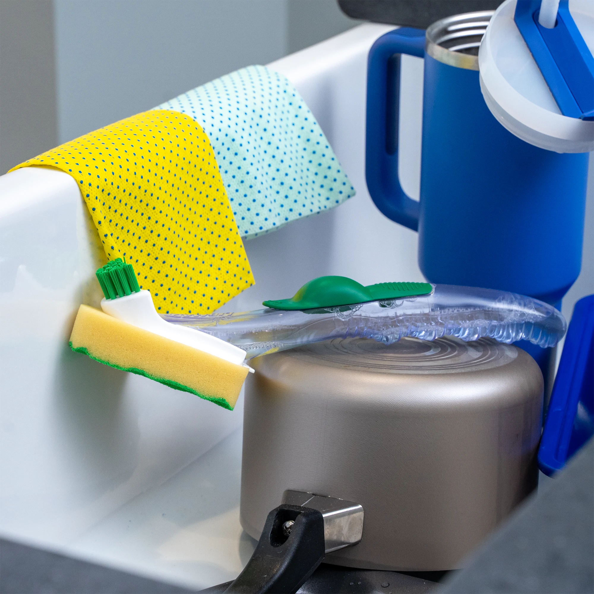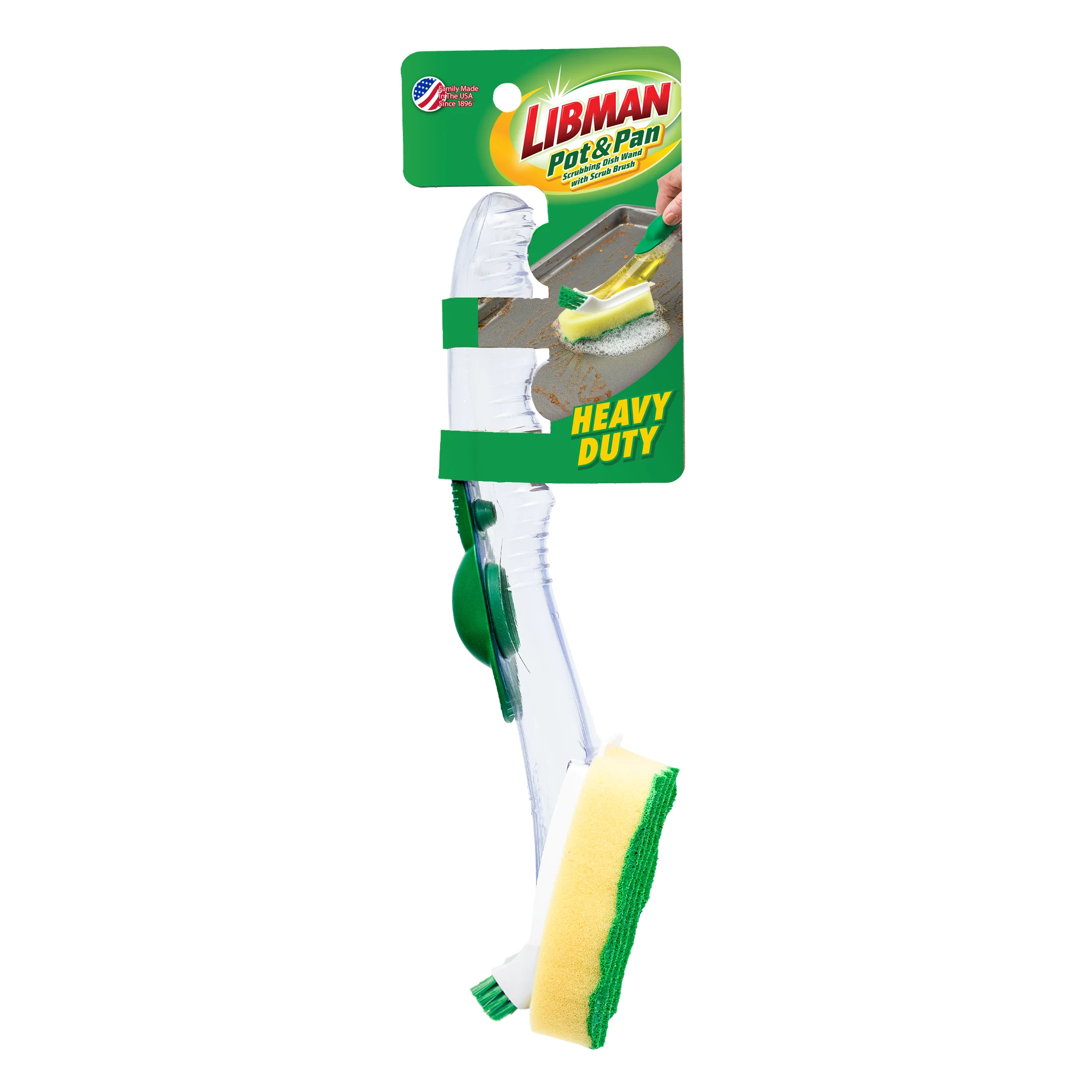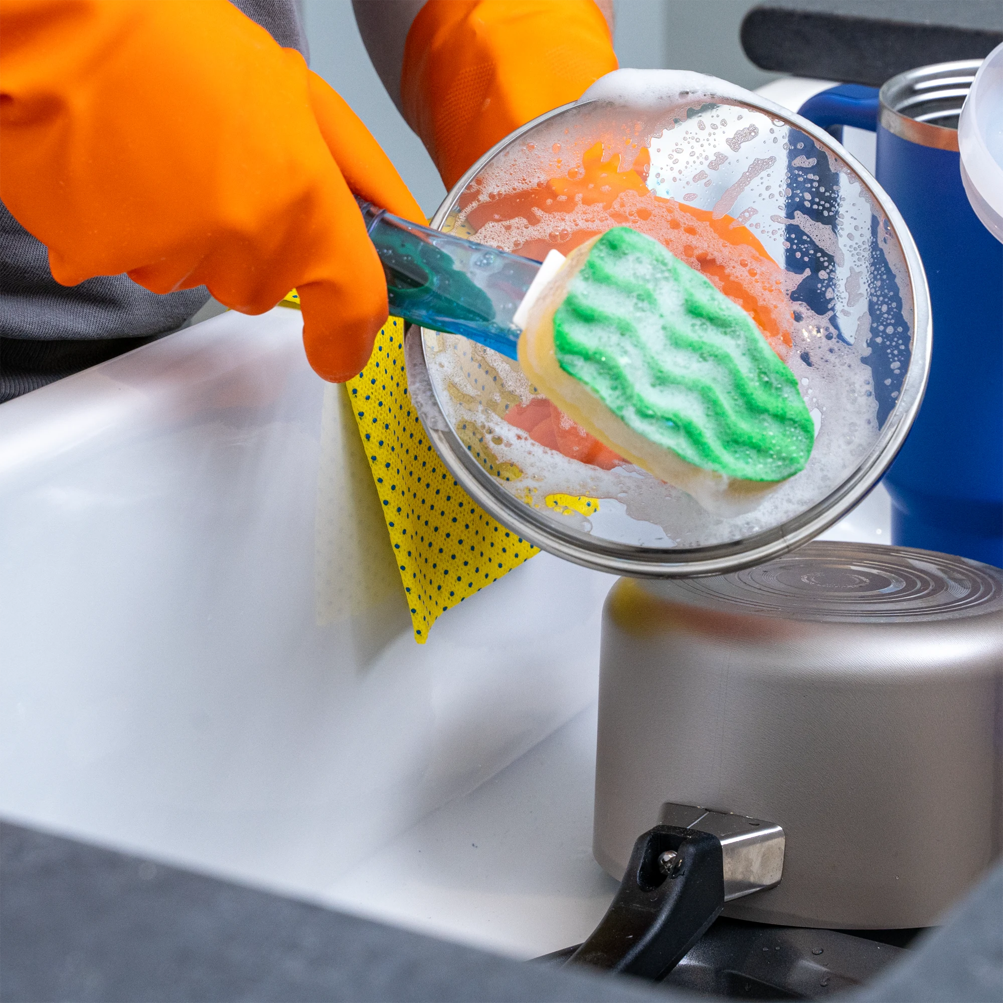 The Pot & Pan Scrubbing Dish Wand with Scrub Brush features a sturdy handle with a contoured grip and a rubber soap-dispensing button for easy filling. Its rinse-clean sponge and integrated scrub brush with PET bristles are shaped to reach into all corners and spaces.